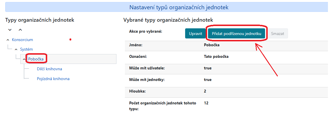 - Na levé straně, ve stromu typů organizačních jednotek najděte typ, který zastupuje knihovnu provozující rezervační box1) a klikněte na označení tohoto typu (např. „Pobočka“, viz obrázek níže).