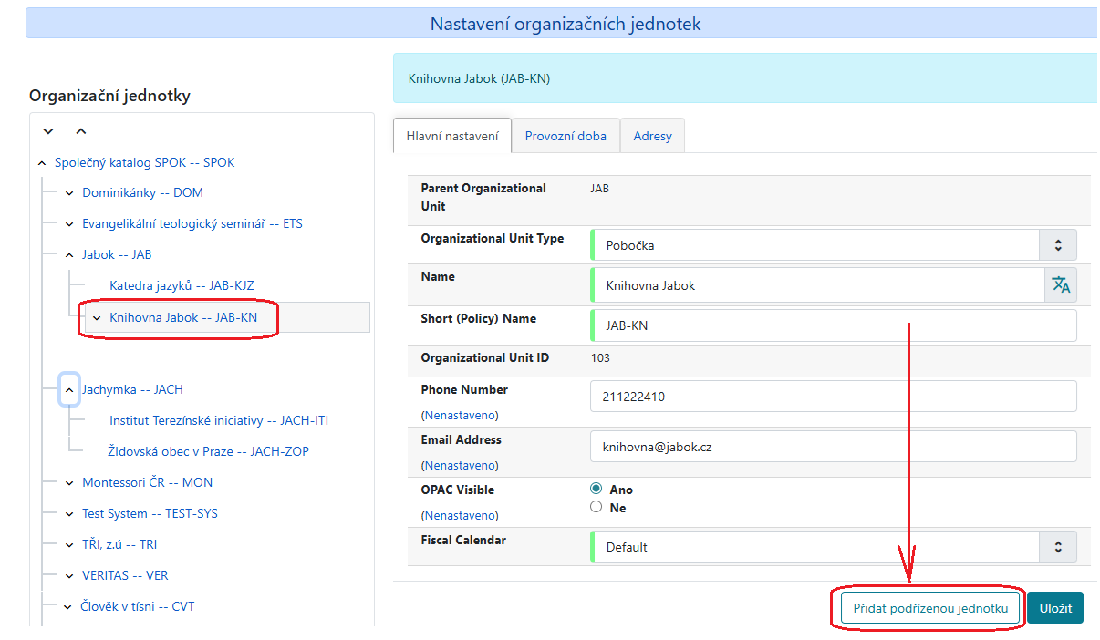 - Na levé straně, ve stromu organizačních jednotek najděte konkrétní pobočku nihovny, která rezervační box provozuje a klikněte na název této položky2), viz příklad Knihovny Jabok na obrázku níže.