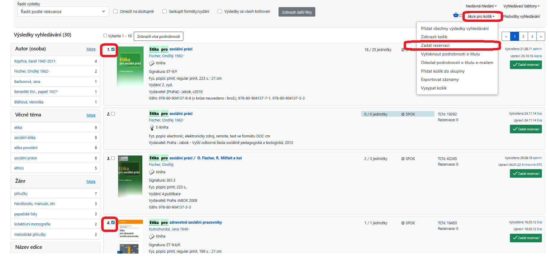 - Tituly, které chcete rezervovat, označte pomocí zaškrtávacího pole nalevo a poté klikněte na rozbalovací tlačítko „Akce pro košík“ (viz obrázek níže).