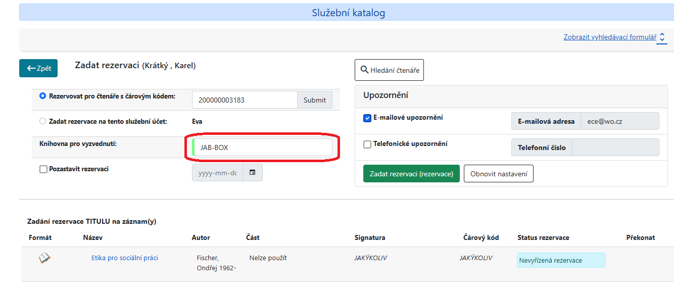 Zadání rezervace s vyzvednutím v JABoxu pro čtenáře (ve služebním klientu Evergreenu)