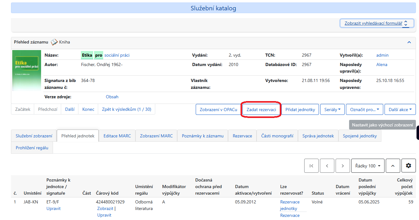 - V seznamu výsledků vyhledávání klikněte napravo vedle požadovaného titulu na zelené tlačítko „Zadat rezervaci“ nebo v detailním záznamu klikněte na tlačítko „Zadat rezervaci“ na liště tlačítek (viz obrázek níže).
